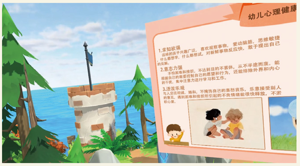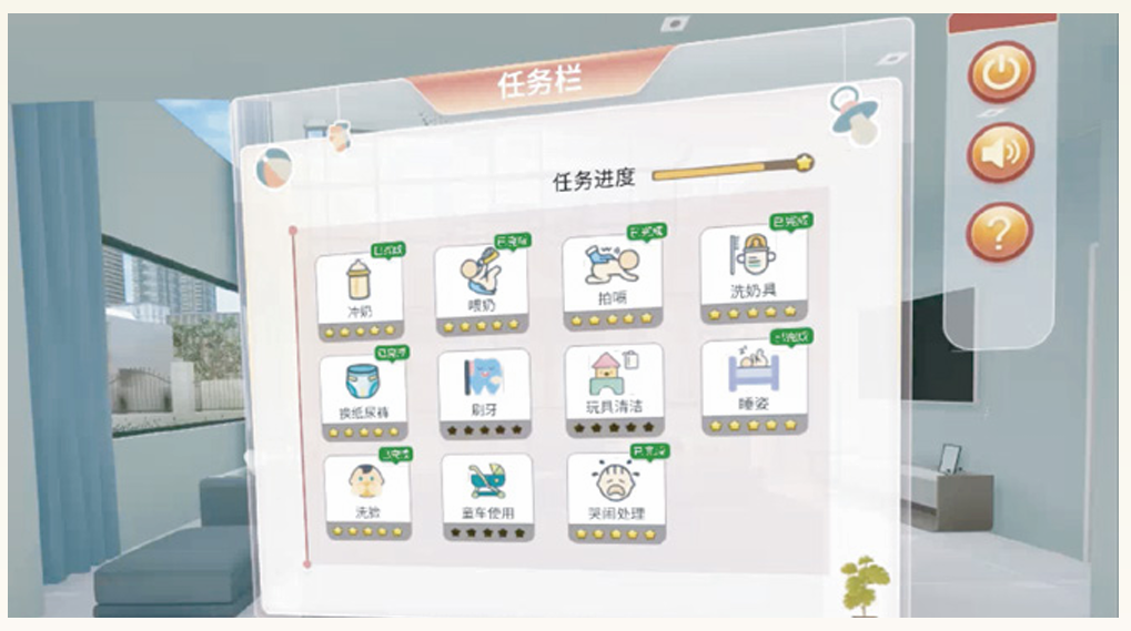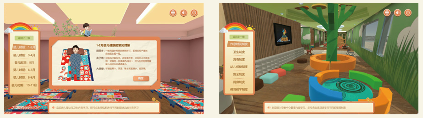 对教学相关知识、实训等内容进行交互式实训任务练习:早期教育情景模拟实训任务系统应通过三维场景、实训任务发布、考题、互动学习游戏、交互操作等方式。