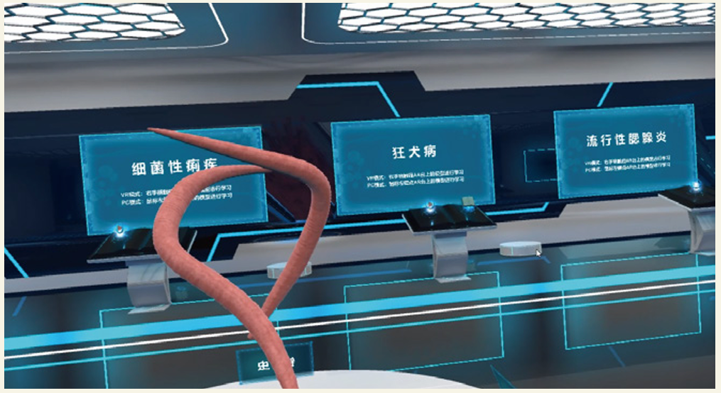 系统以三维动画还原园区安全防护与管理场景,并以三维建模动画还原老师处理安全防护与管理的处理过程。学生通过触发交互设备选择社交园区安全防护与管理、儿童意外伤害应急处理、突发安全事件3类模拟实训。过程中包含知识点和园区安全防护与管理在线答题。