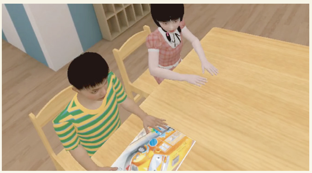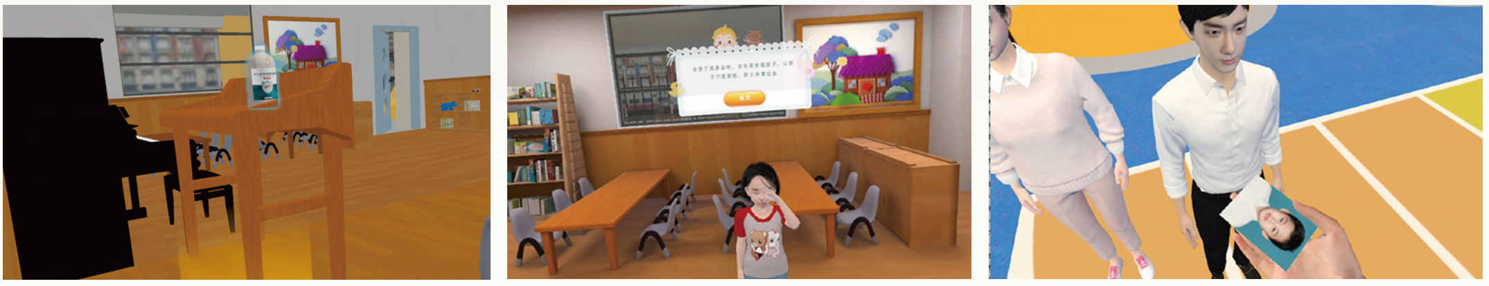 以幼儿园环境为参照物,并结合虚拟现实技术而成。共分为五个模块:捣乱行为、入园情绪、攻击行为、告状行为、社交行为。