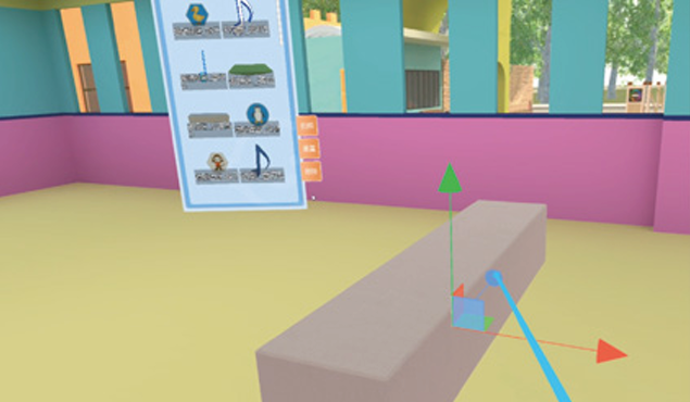 软件包含室外公共环境创设和室内公共环境创设两个模块,系统提供模型库,学生可选择模型库内任一模型,在场景中进行拖动、摆放。摆放时,用户可通过交互设备,来调整任一模型的位置和大小。